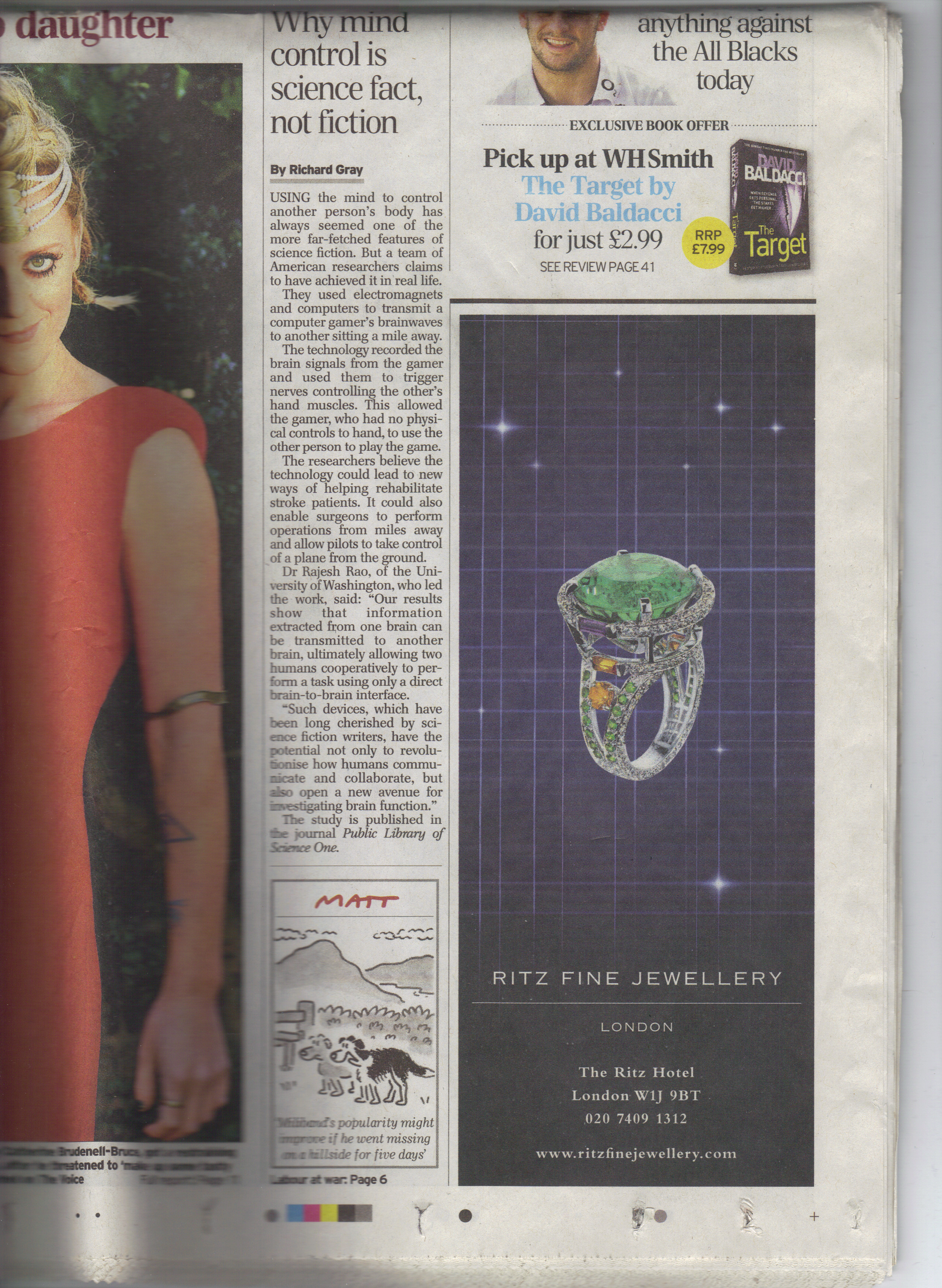 This Daily Telegraph article from the 08 November 2014 explains how scientists have managed to link two brains together to control another persons body.