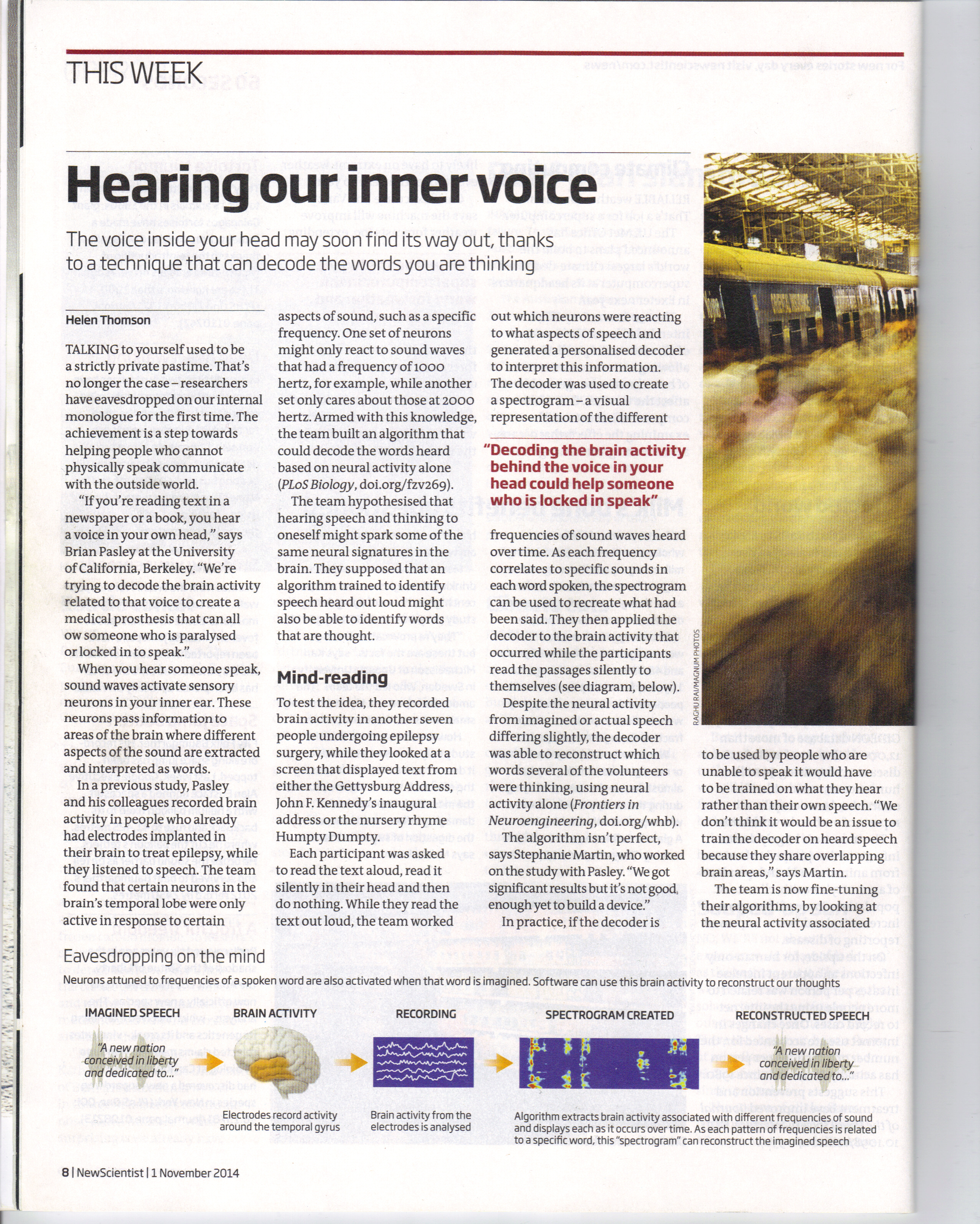 This New Scientist magazine article from 29 October 2014 issue 2993 published 01 November 2014 describes how they are admitting to being able to hear your thoughts. This is half of the electronic implants transceiver capability. If they can listen in then they can transmit back to you too. So we have it in the mainstream about hearing thoughts via technological means. Half way admitting to technological telepathy. Below is the article in full from the new scientist website. With scanned images of the article as it appeared in the printed version at the end.